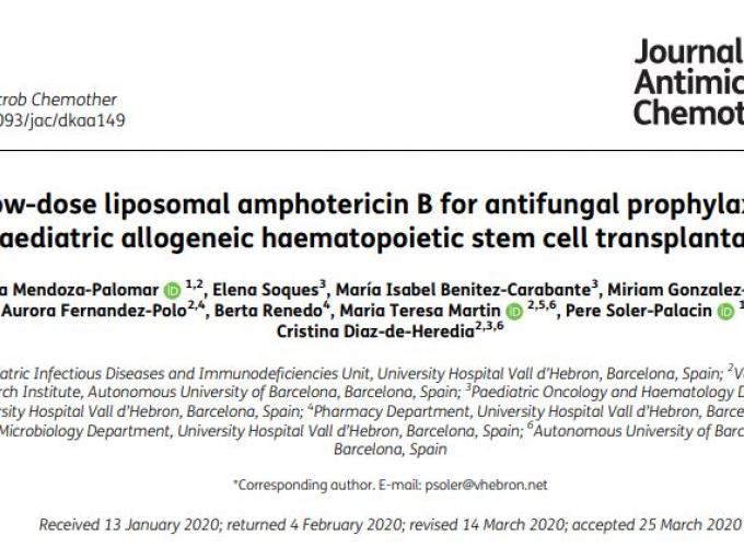 Membres de la UPIIP publiquen "Low-dose liposomal amphotericin B for antifungal prophylaxis in paediatric allogeneic haematopoietic stem cell transplantation" al Journal of Antimicrobial Chemotherapy.
