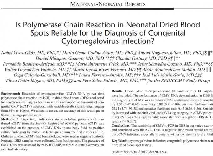 El artículo "Is Polymerase Chain Reaction in Neonatal Dried Blood Spots Reliable for the Diagnosis of Congenital Cytomegalovirus Infection?", publicado por miembros de la UPIIP, ha sido seleccionado como "Editors pick 2019" y opta a un premio "2020 ESPID-PIDJ Award" otorgado por el ESPID Committee for Scientific Affairs and Award.